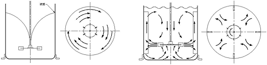 A. 中心插浸在低黏度且無擋板阻流之操作時(shí),液體會產(chǎn)生打旋現(xiàn)象(圖D),攪拌速度越快則打旋越強(qiáng)烈,此種混合效率最低,通常系加裝擋板加以消除(圖E),在直立槽內(nèi)加裝四個(gè)直立標(biāo)準(zhǔn)擋板組,板寬約槽直徑之1/10~1/12左右,由於進(jìn)一步增加板寬時(shí)并未發(fā)現(xiàn)動力增加,故由輪葉動力消耗觀點(diǎn)看,此項(xiàng)寬度并不能視為標(biāo)準(zhǔn)之板寬,因?yàn)閷?shí)驗(yàn)證明發(fā)現(xiàn),板寬范圍有助於流體上下打混,并消除渦流現(xiàn)象。但是板數(shù)增加時(shí),動力消耗增加。當(dāng)液體黏度增加時(shí),對擋板需求層度隨之降低,板寬隨之減小,擋板可與槽壁保留適度之空隙讓流體穿過,而不至於產(chǎn)生滯留現(xiàn)象,更高黏度之液體則可采用斜角度方式安裝。