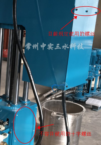 今天何總在車間里抽檢一臺(tái)準(zhǔn)備出廠的升降式攪拌機(jī)時(shí)發(fā)火了,起因就是為了這臺(tái)攪拌機(jī)安裝面板上用了幾顆不符合出廠要求的螺絲釘(下圖中標(biāo)注的十字螺絲現(xiàn)在規(guī)定都應(yīng)換成內(nèi)六角螺絲)。